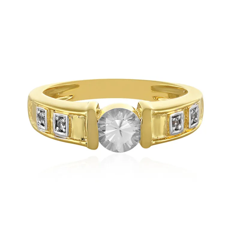Dieser atemberaubende, mit Präzision gefertigte Ring zeigt einen zentralen kambodschanischen Zirkon im Rundschliff mit einer Größe von ca. 5 mm, gefasst in glitzerndem 925er Sterlingsilber mit reicher Goldplattierung. Akzentuiert durch vier kleinere Zirkone von insgesamt 0,065ct, strahlt dieses Stück eine zeitgenössische Eleganz aus. Mit einem Gewicht von ca. 2,35 g ist es ein opulentes Statement. Perfekt, um Ihrem alltäglichen Outfit einen Hauch von Luxus zu verleihen, oder als i-Tüpfelchen für besondere Anlässe.