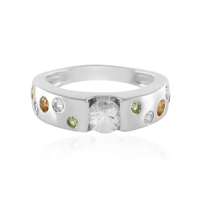 Entdecken Sie die Faszination dieses bezaubernden mehrfarbigen Edelsteinrings mit einer harmonischen Mischung aus glänzenden kambodschanischen Zirkonen, lebhaften brasilianischen Zitrinen und funkelnden chinesischen Peridots, die alle in 925er Sterlingsilber gefasst sind. Mit einem Gesamtkaratgewicht von 1,161 ct verfügt dieses moderne Schmuckstück über einen zentralen Zirkon im Rundschliff von 0,675 ct, der von einer Symphonie kleinerer Edelsteine flankiert wird, die einen raffinierten Regenbogeneffekt um das Band herum erzeugen. Perfekt, um Ihrem Alltagsoutfit einen Hauch von Eleganz zu verleihen oder ein Outfit für einen besonderen Anlass zu ergänzen.