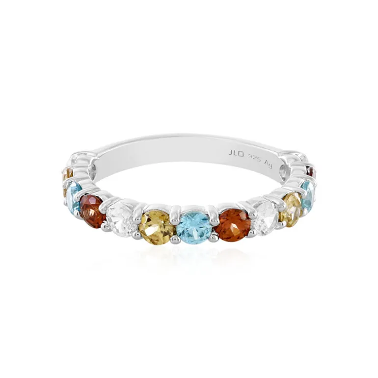 Schmücken Sie Ihre Hand mit diesem farbenfrohen Ensemble aus kambodschanischen und tansanischen Zirkonsteinen. Dieser verführerische Ring kombiniert die warmen Farben von cognacfarbenen, goldenen und himmelblauen Zirkonen mit insgesamt 2,075 Karat, die sorgfältig in einem runden Brillant geschliffen sind. Jeder Edelstein ist präzise in ein schlankes 925er Sterlingsilberband mit eleganter Platinplattierung eingefasst und wiegt etwa 1,91 Gramm. Ob Sie sich für einen besonderen Anlass herausputzen oder Ihren täglichen Stil akzentuieren, dieser Ring bietet vielseitigen Charme und einen Hauch von Farbe.