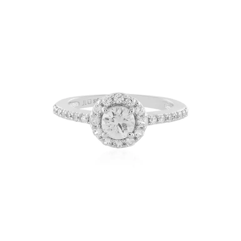 Entdecken Sie die Anziehungskraft dieses funkelnden Zirkonrings aus Kambodscha, gefasst in luxuriösem platiniertem 925er Sterlingsilber, das Raffinesse ausstrahlt. Der zentrale Zirkon mit einem Gewicht von 0,568 ct und einem meisterhaften Rundschliff, mit einem Durchmesser von ca. 4,8 mm, wird von 12 Zirkonen mit einem Gesamtgewicht von 0,239 ct umringt. Vervollständigt wird das Ensemble durch 14 zart platzierte Zirkone mit einem Gewicht von 0,166 ct, die den Halo und die Schenkel veredeln. Die Kombination der Edelsteine ergibt ein Gesamtkaratgewicht von 0,973 ct. Dieser Ring mit den Maßen 22×20 mm ist die perfekte Ergänzung zu jeder Abendgarderobe oder ein subtiler Funke für Ihren Alltagslook.