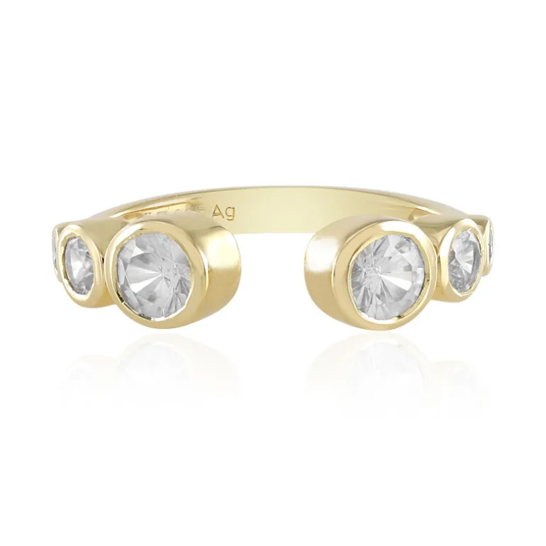Entdecken Sie die Anziehungskraft dieses wunderschön gestalteten Rings mit kambodschanischen Zirkonen, die in vergoldetes 925er Sterlingsilber gefasst sind. Die sorgfältig gearbeiteten Rundschliffe von insgesamt 0,99 Karat erzeugen bei jeder Geste ein funkelndes Lichtspiel. Die anmutige Wölbung und der satte Goldton des Bandes sorgen dafür, dass dieser Ring sowohl zu legerer als auch zu formeller Kleidung passt. Seine moderne Eleganz macht ihn zu einem idealen Geschenk oder zu einem neuen Lieblingsstück in Ihrer persönlichen Sammlung.