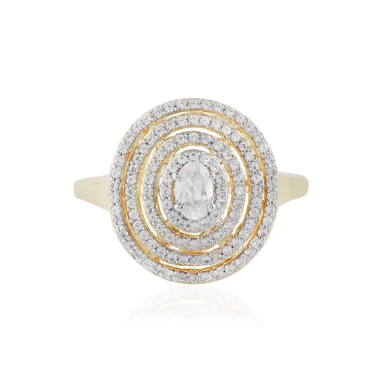 Dieser auffällige Ring präsentiert die schillernde Schönheit kambodschanischer Zirkone, die in spiralförmigen Mustern auf glänzendem 925er Sterlingsilber mit einer Goldauflage gefasst sind. Der ovale Mittelteil mit einem Gesamtgewicht von 1,485 Karat ist von einem faszinierenden Wirbel aus 118 Zirkon-Akzenten im Rundschliff umgeben. Das filigrane Design erinnert an himmlische Galaxien und macht ihn zu einem besonderen Schmuckstück für besondere Anlässe. Kombinieren Sie diesen exquisiten Ring mit einem klassischen Abendkleid oder einem schicken Cocktailkleid, um Ihr Ensemble aufzuwerten.