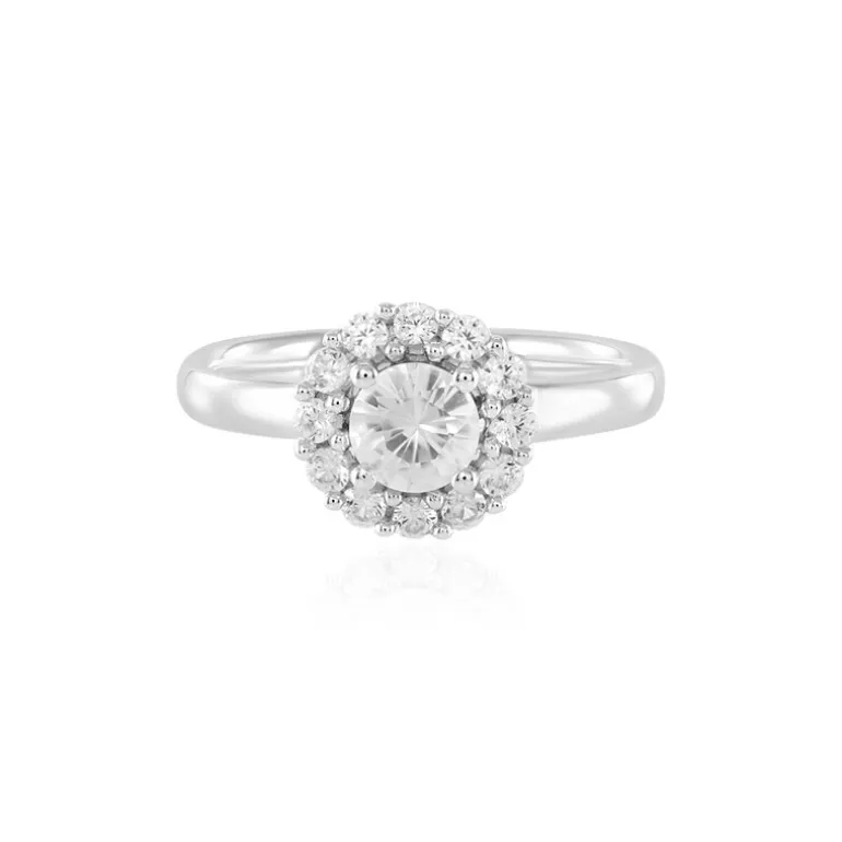 Entdecken Sie die zeitlose Eleganz dieses Rings aus Sterlingsilber mit einem fesselnden kambodschanischen Zirkon im Rundschliff, der von einem Kranz funkelnder kleinerer Zirkone umgeben ist. Ein Gesamtkaratgewicht von 1,026 ct sorgt für eine schillernde Darstellung von Licht und Farbe an Ihrem Finger. Das schlichte Design des Silberbands ergänzt den leuchtenden Charme des Rings. Kombinieren Sie dieses exquisite Schmuckstück mit Abendgarderobe oder setzen Sie einen raffinierten Akzent zu Ihrem Alltagsoutfit. Ideal für alle, die die Anziehungskraft von fein gefertigtem Edelsteinschmuck zu schätzen wissen.