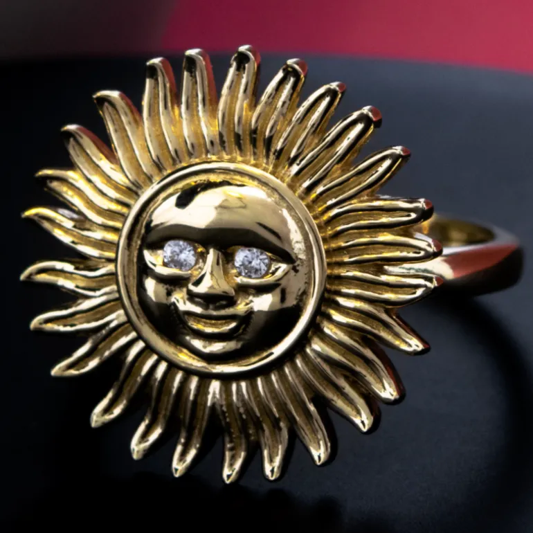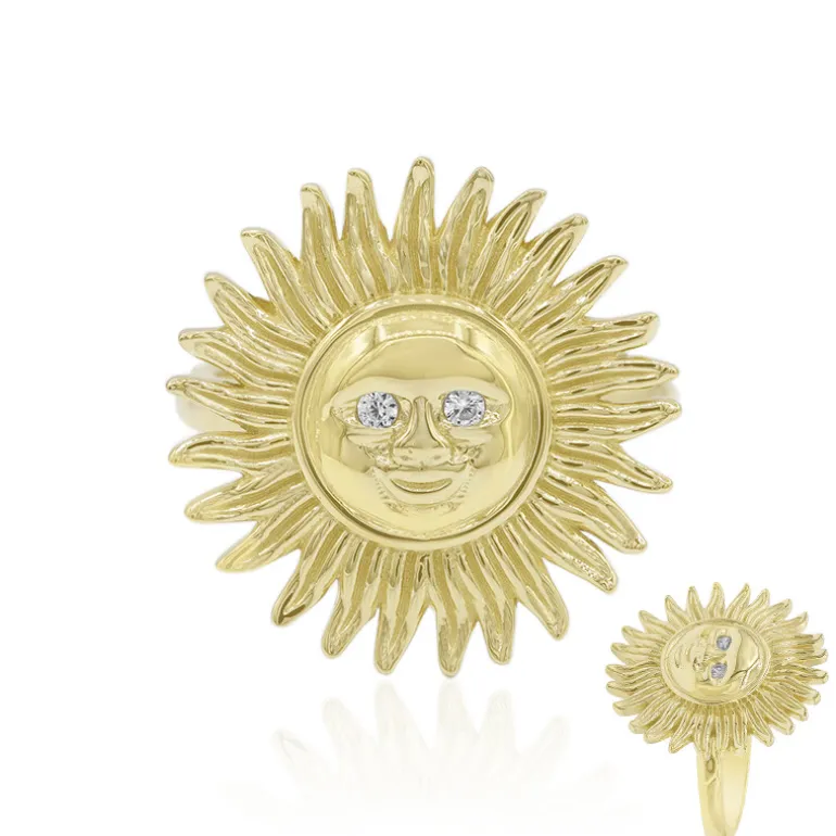 Strahlen Sie Freude und Wärme aus mit diesem bezaubernden Ring aus vergoldetem 925er Sterlingsilber, der mit einem Sonnenmotiv gekrönt ist, das garantiert alle Blicke auf sich zieht. Das Schmuckstück ist mit zwei funkelnden kambodschanischen Zirkonen im Rundschliff von insgesamt 0,04 Karat besetzt, die die Augen der Sonne darstellen. Mit einem Gesamtmetallgewicht von ca. 4,56 g fängt er die Essenz des Sommers auf Ihrem Finger ein. Ein ideales Accessoire, um das Alltagsoutfit zu verschönern oder der Abendgarderobe eine verspielte Note zu verleihen. Dieser himmlische Ring ist eine charmante Ergänzung Ihrer Sammlung oder ein sonniges Geschenk für einen besonderen Menschen.