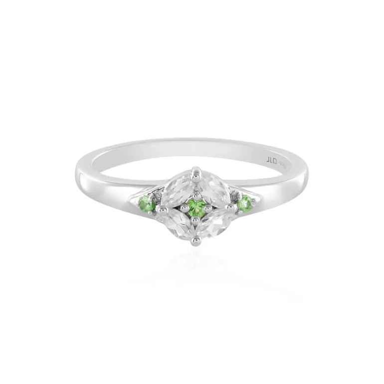 Dieser zarte Ring zeigt die klare Brillanz von vier kambodschanischen Zirkonen im Marquiseschliff von insgesamt 0,4 ct, die durch die grünen Farbtöne des tansanischen Tsavorits von 0,061 ct akzentuiert werden. Dieser elegante Ring ist aus 925er Sterlingsilber gefertigt und für zusätzlichen Glanz mit Platin überzogen. Mit seinen Abmessungen von 22×19 mm ist er ein subtiles, aber auffälliges Statement. Dieses Schmuckstück eignet sich sowohl für zwanglose Anlässe als auch für wichtige Ereignisse und ergänzt Ihre Lieblingsoutfits mit seinem funkelnden Ensemble aus Edelsteinen.