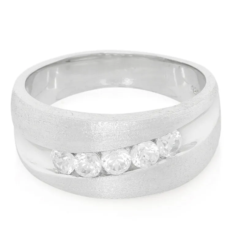 Entdecken Sie die schlichte Eleganz dieses Rings aus Sterlingsilber, der mit fünf sorgfältig geschliffenen kambodschanischen Zirkonen von insgesamt 0,863 Karat besetzt ist. Die Edelsteine funkeln mit einem runden Brillantschliff und präsentieren ihre Klarheit vor dem kühlen Glanz des 925er Sterlingsilbers, das etwa 4,46 Gramm wiegt. Sein modernes Banddesign macht ihn zu einem vielseitigen Accessoire, das sich sowohl für legere als auch für formelle Anlässe eignet. Kombinieren Sie ihn mit einem einfarbigen Outfit, um Ihrem Ensemble einen Hauch von Raffinesse zu verleihen.