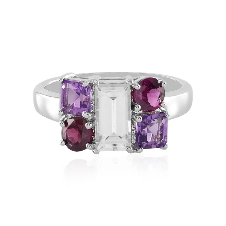 Entdecken Sie die Eleganz dieses atemberaubenden Rings mit einem fesselnden kambodschanischen Zirkon von 2,266 Karat im Baguetteschliff, flankiert von Umbalit-Granaten und sibirischen Amethysten. Dieses schillernde Schmuckstück aus platiniertem 925er Sterlingsilber ist perfekt, um jeder Abendgarderobe einen Hauch von Glamour zu verleihen. Ideal für besondere Anlässe oder als einzigartiges Schmuckstück.