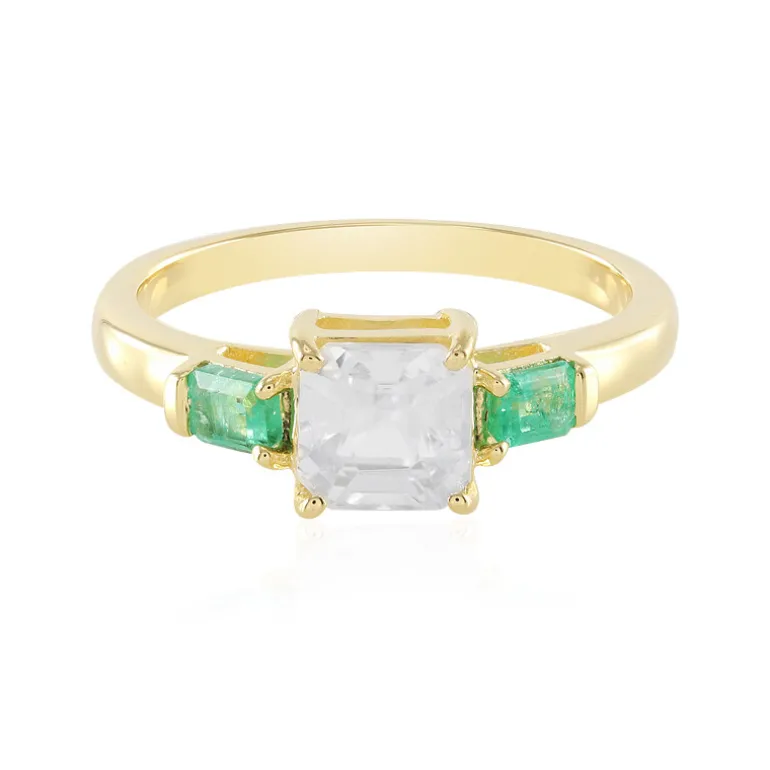Entdecken Sie die Faszination dieses vergoldeten Rings aus Sterlingsilber mit einem 2,599 Karat schweren kambodschanischen Zirkon im einzigartigen Asscher-Schliff in der Mitte, flankiert von zwei lebhaften russischen Smaragden mit einem Gesamtgewicht von 0,509 Karat im harmonischen Achteckschliff. Mit einem Edelsteingewicht von insgesamt 3,108 ct ist dieses Stück nicht nur ein Ring, sondern ein Statement der Eleganz. Der raffinierte Kontrast zwischen klaren Zirkonen und sattgrünen Smaragden passt zu formellen Anlässen und verleiht Alltagsoutfits einen Hauch von Opulenz.