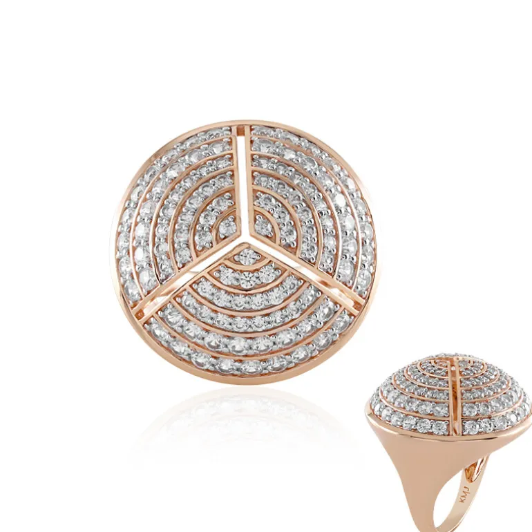 Dieser prächtige Ring aus rosévergoldetem 925er Sterlingsilber ist mit 105 schillernden kambodschanischen Zirkonen im Rundschliff von insgesamt 3,267 Karat besetzt. Die strahlenden Steine sind fachmännisch in einem konzentrischen, kreisförmigen Muster gefasst und zeigen eine unvergleichliche Handwerkskunst. Dieses Schmuckstück ist perfekt, um Ihrer Abendgarderobe einen Hauch von Eleganz zu verleihen oder als glamouröses Accessoire für besondere Anlässe zu dienen. Setzen Sie ein Zeichen mit dieser exquisiten Ergänzung Ihrer Schmucksammlung, die Sie fesseln und verzaubern wird.