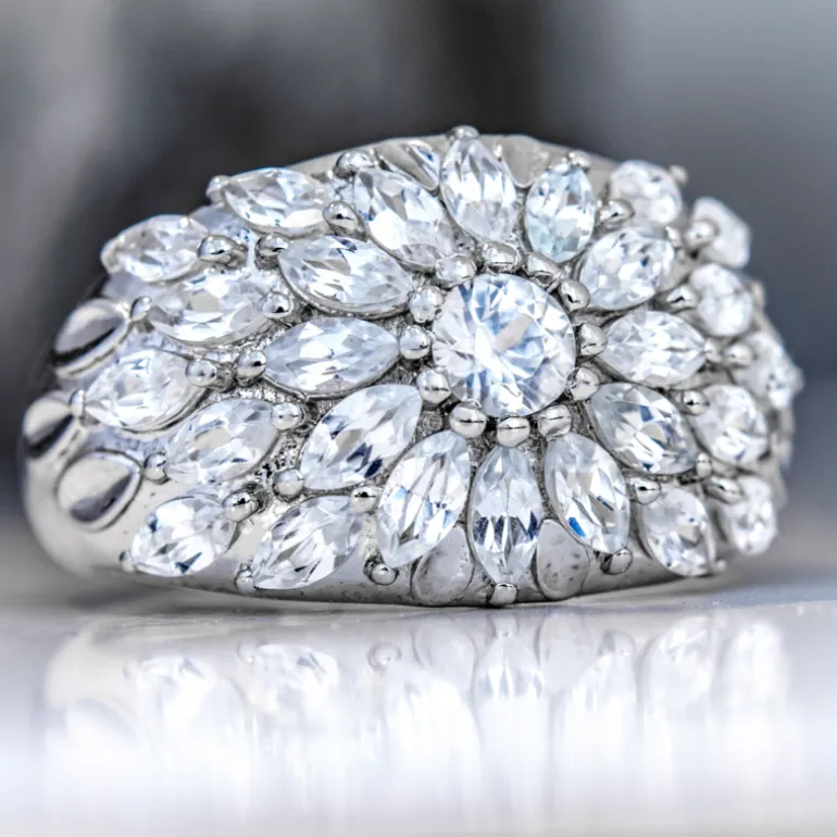 Dieser prächtige Ring funkelt mit dem Glanz kambodschanischer Zirkone von insgesamt fast 3 Karat, gefasst in hochwertigem 925er Sterlingsilber mit einer Platinveredelung für zusätzlichen Glanz. Inspiriert von der organischen Schönheit einer Blüte, sind die marquise und rund geschliffenen Edelsteine exquisit angeordnet, um zarte Blütenblätter zu imitieren und ein florales Motiv zu schaffen, das zeitlos und doch modern ist. Dieser Ring ist ein vielseitiges Schmuckstück, das sich sowohl mit legerer als auch mit formeller Kleidung kombinieren lässt und jeden Moment ein wenig heller erscheinen lässt.