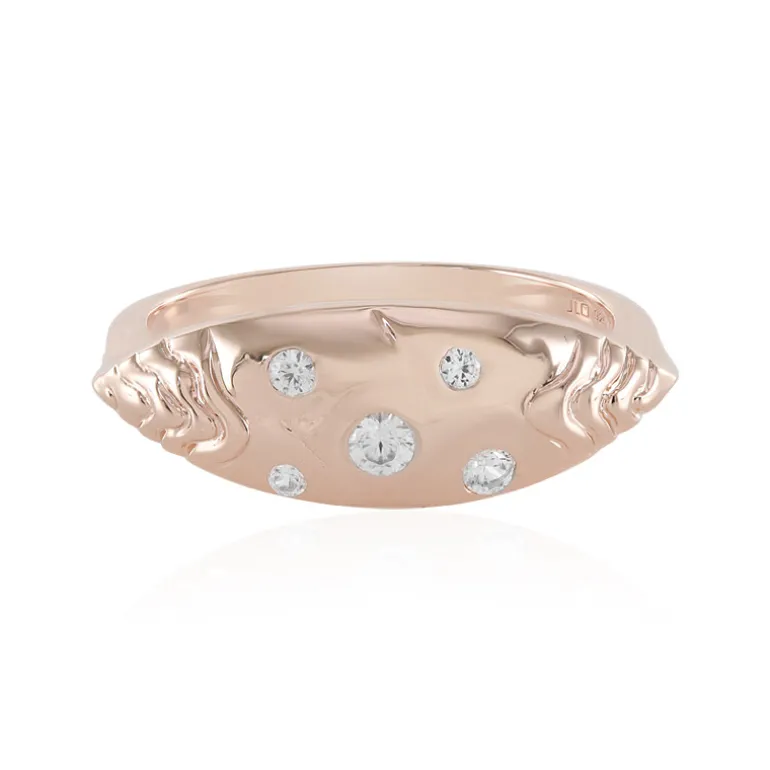 Dieser schicke Ring besticht durch seine schimmernden kambodschanischen Zirkone von insgesamt 0,203 Karat, die in wunderschönes rosévergoldetes 925er Sterlingsilber gefasst sind. Jeder Stein, fachmännisch facettiert im Rundschliff, glänzt mit Klarheit, umhüllt von einem einzigartigen, wellenförmigen Design, das Ihren Finger mit einer Grundfläche von 21×21 mm ziert. Dieser Ring eignet sich perfekt für einen eleganten Tag oder einen eleganten Abend und ist eine vielseitige Ergänzung für jede Schmucksammlung. Kombinieren Sie ihn mit neutralen Tönen für ein subtiles Funkeln oder mit dunkleren Tönen, um ihn wirklich hervorzuheben.